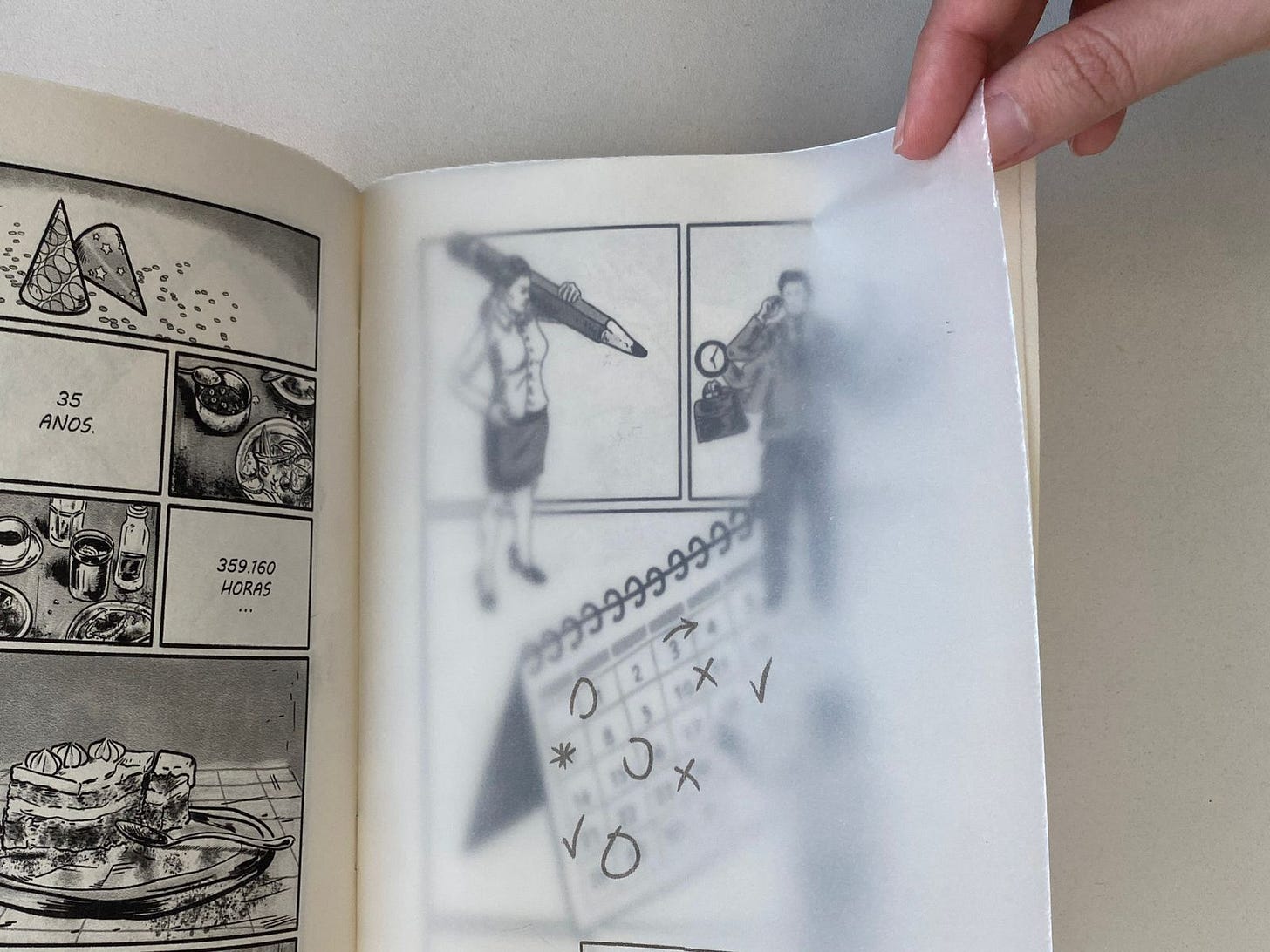 Um detalhe da obra Relógio, de Valter Moreira, que propõe uma reflexão sobre diferentes maneiras de experimentar o tempo. Discorre sobre a dificuldade de equilibrar a vida no meio fio que separa as duas possíveis dimensões do tempo: racional e subjetiva. No projeto gráfico, o papel vegetal traz diferentes camadas narrativas. Valter Moreira é professor, pesquisador, quadrinista e artista plástico. Uma seleção das obras dele, publicadas pelo Selo Risco Impresso, estão agora disponíveis na banca física e virtual da Banca Tatuí.