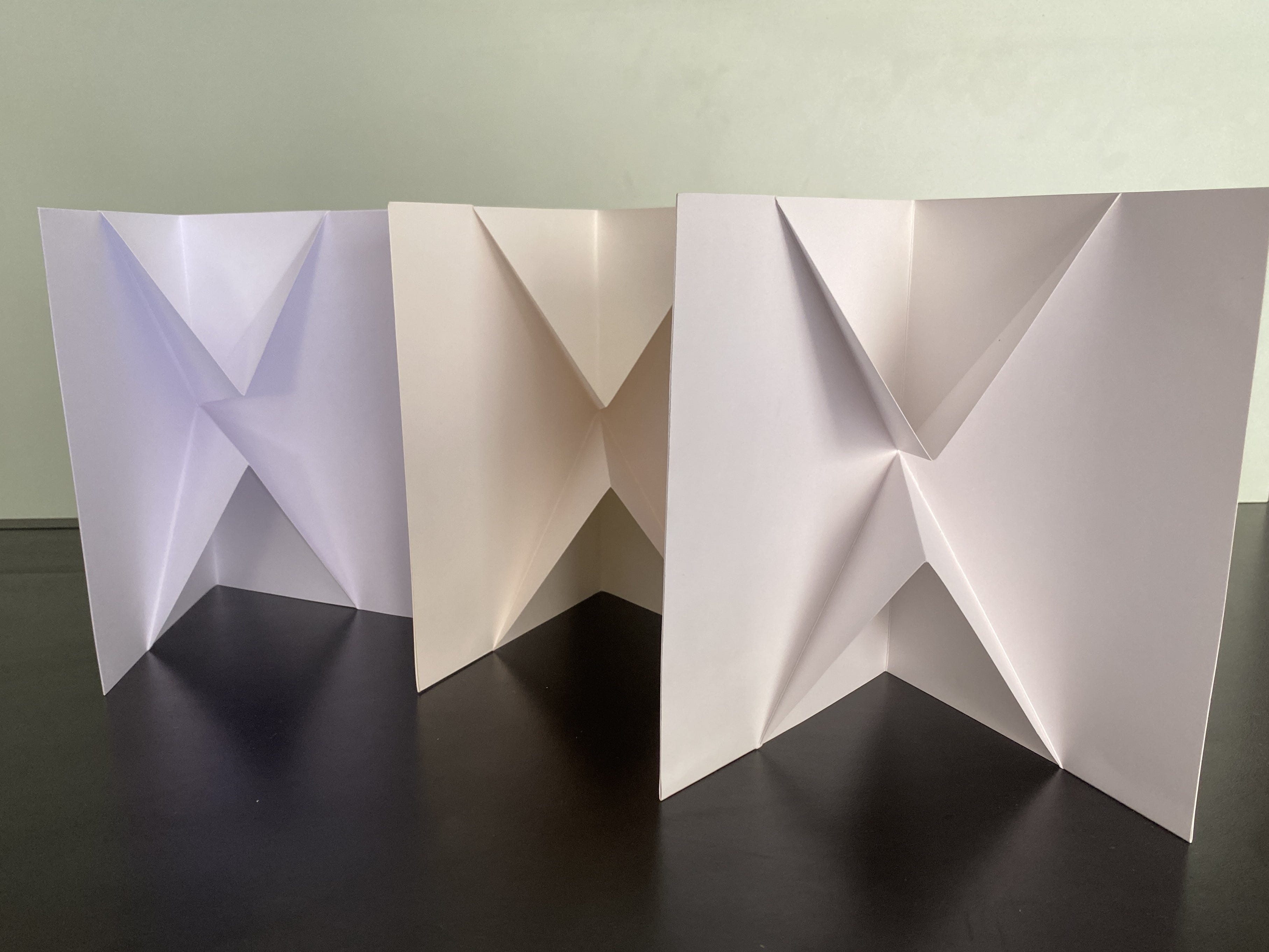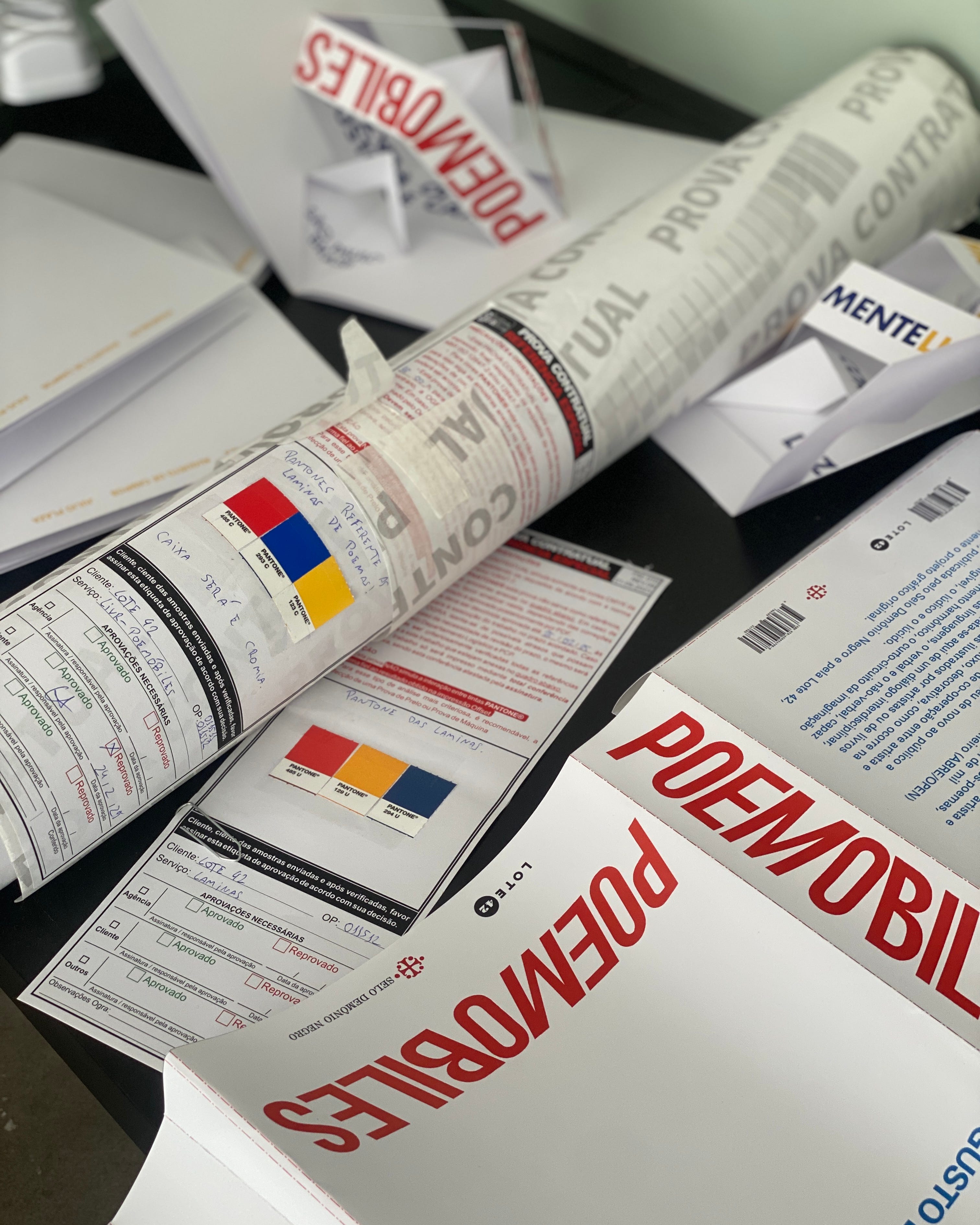 Uma delas era a montagem do pop-up: ao invés de colar uma folha em cima da outra, o pop-up seria impresso em uma única folha, passaria pelo processo de corte e vinco e depois seria dobrada pela metade. Caco argumentou que isso facilitaria demais o acabamento e também garantiria ainda melhores resultados. A seguir imagens de um dos poemóbiles, ainda sem a cola.